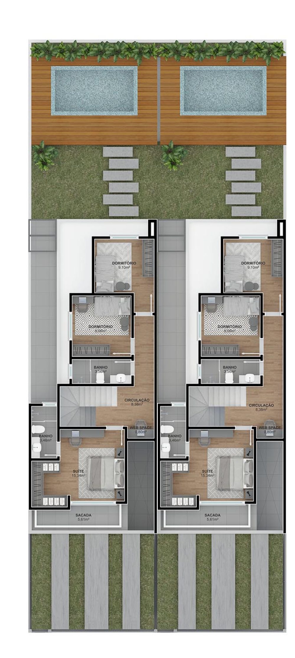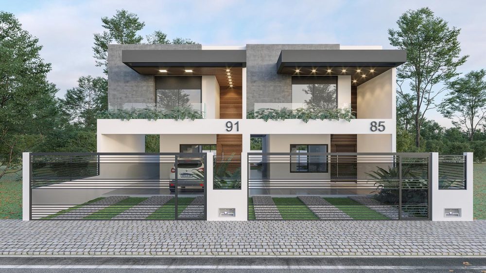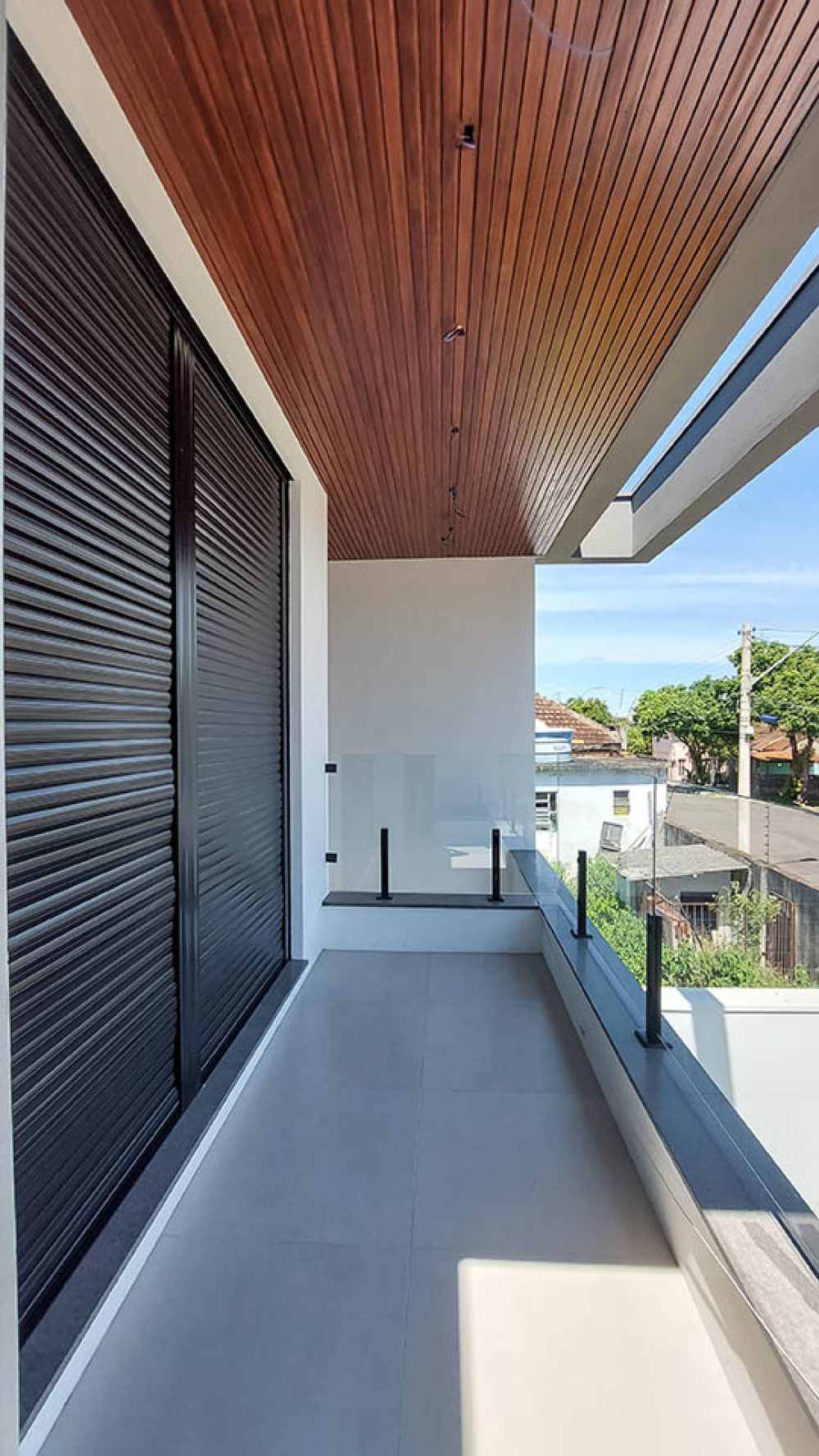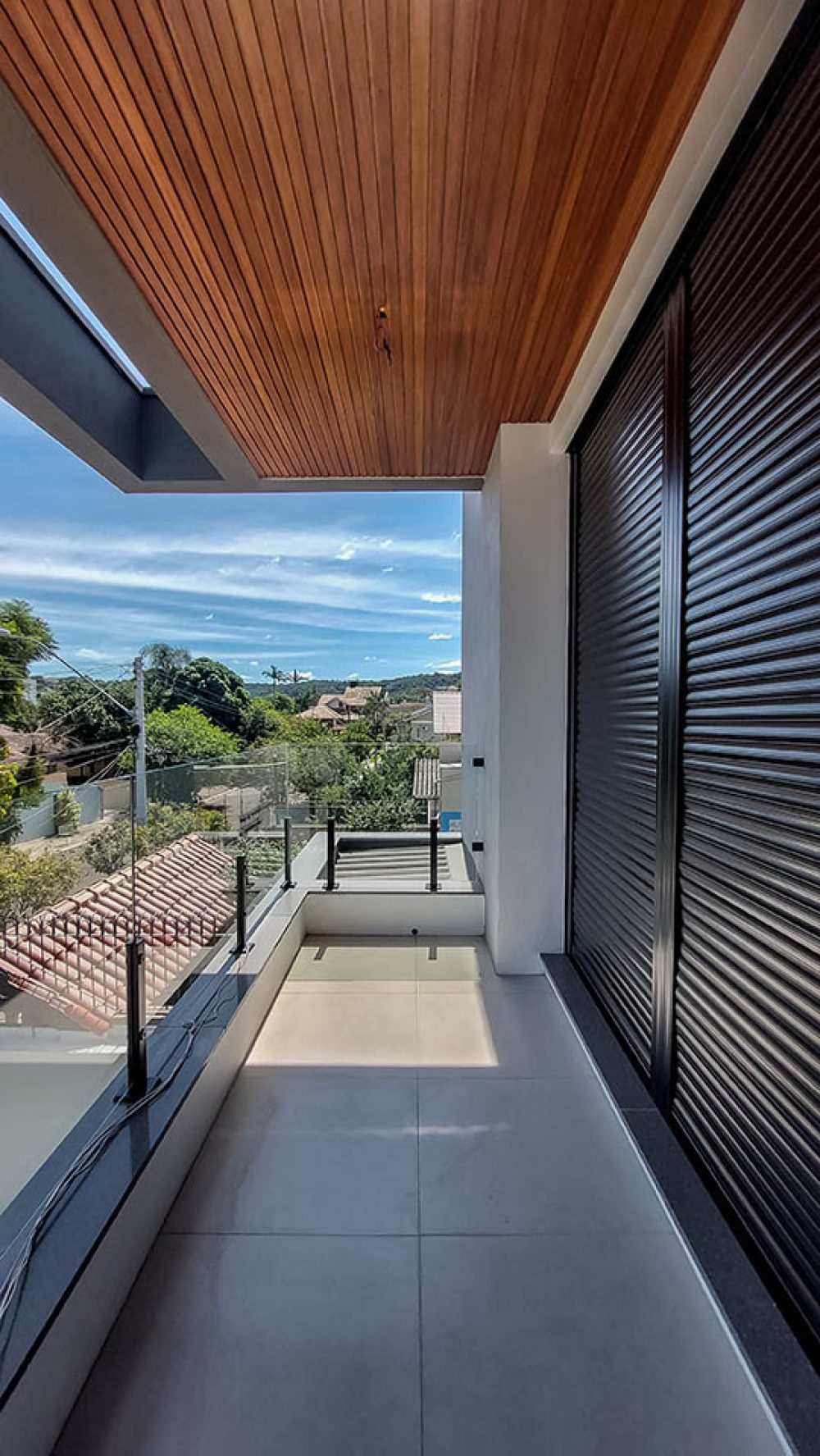 - Detalhes de revestimento no teto da fachada em madeira de lei;